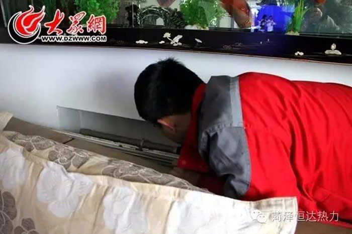 任永輝鉆進(jìn)沙發(fā)縫里,查看沙發(fā)后面的供熱管道,濾網(wǎng)有些臟,任永輝決定清洗管道