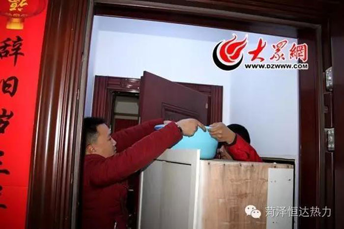 劉明賢在D棟12樓居民張大爺家中測(cè)試溫度,室溫剛剛達(dá)標(biāo),劉明賢和任永輝開始查找原因