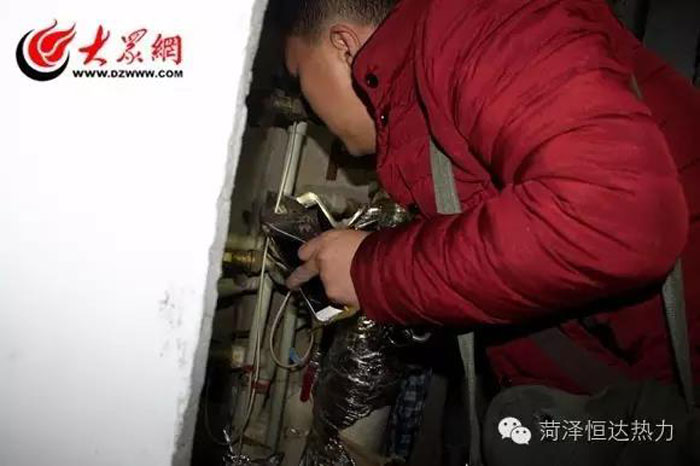 劉明賢在C棟居民家里檢測(cè)供熱設(shè)備,空間狹小,劉明賢用手機(jī)閃光燈照明