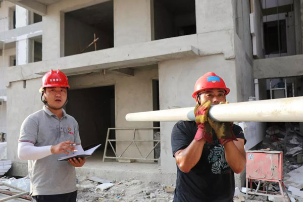 在天潤府小區(qū)施工現(xiàn)場,畢敬賢正在督導施工人員安裝小區(qū)單元立管,在弱電井不足1平方米的空間里,陰暗、潮濕、悶熱,畢敬賢和工人師傅們額頭上汗珠不停滾落。雖然小區(qū)的二級熱網建設通常都集中在酷暑夏季,但這從不影響熱力人工作的熱情。冬季忙供熱,夏季忙建設,默默無聞的堅守在崗位上,奮戰(zhàn)在一線,全力以赴保任務、促進度、搶工期,不叫一聲苦,不喊一聲累,以實際行動保障新小區(qū)如期用暖。