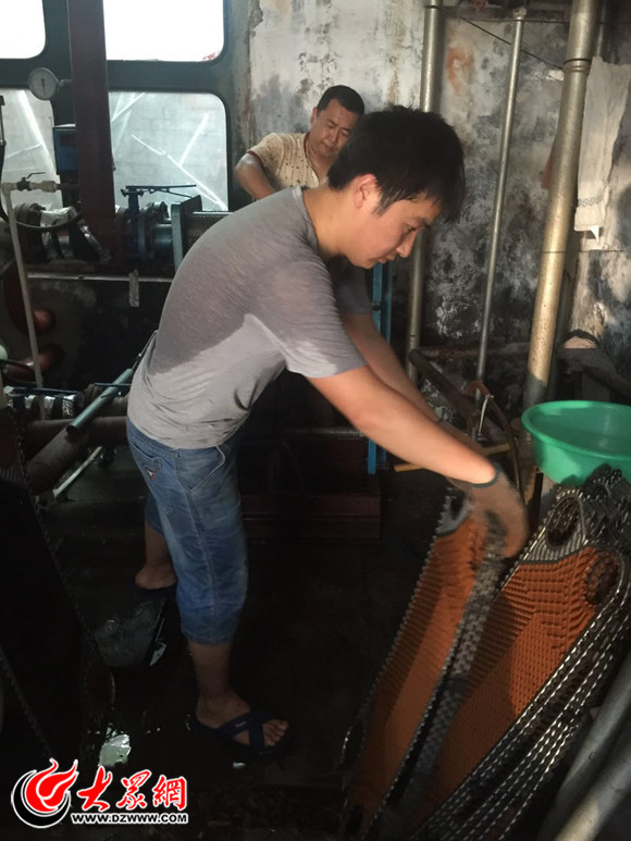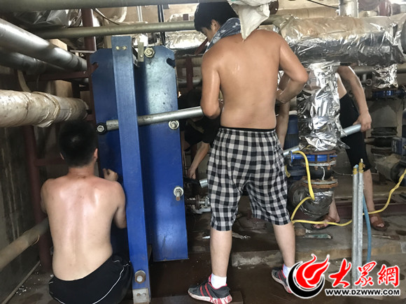 下午4時左右,大眾網(wǎng)記者來到位于丹陽路上的國稅局家屬院。家屬院角落處的供熱設(shè)備機(jī)房內(nèi)悶熱狹小,空氣流通不暢,大眾網(wǎng)記者剛進(jìn)去一小會就已經(jīng)汗流浹背。正在清洗換熱器的供暖管理員們有的光著膀子作業(yè),身上水光锃亮,有的脖子上掛著毛巾,但沒過幾分鐘剛在水管洗凈擰干的毛巾又已經(jīng)滿是汗水。