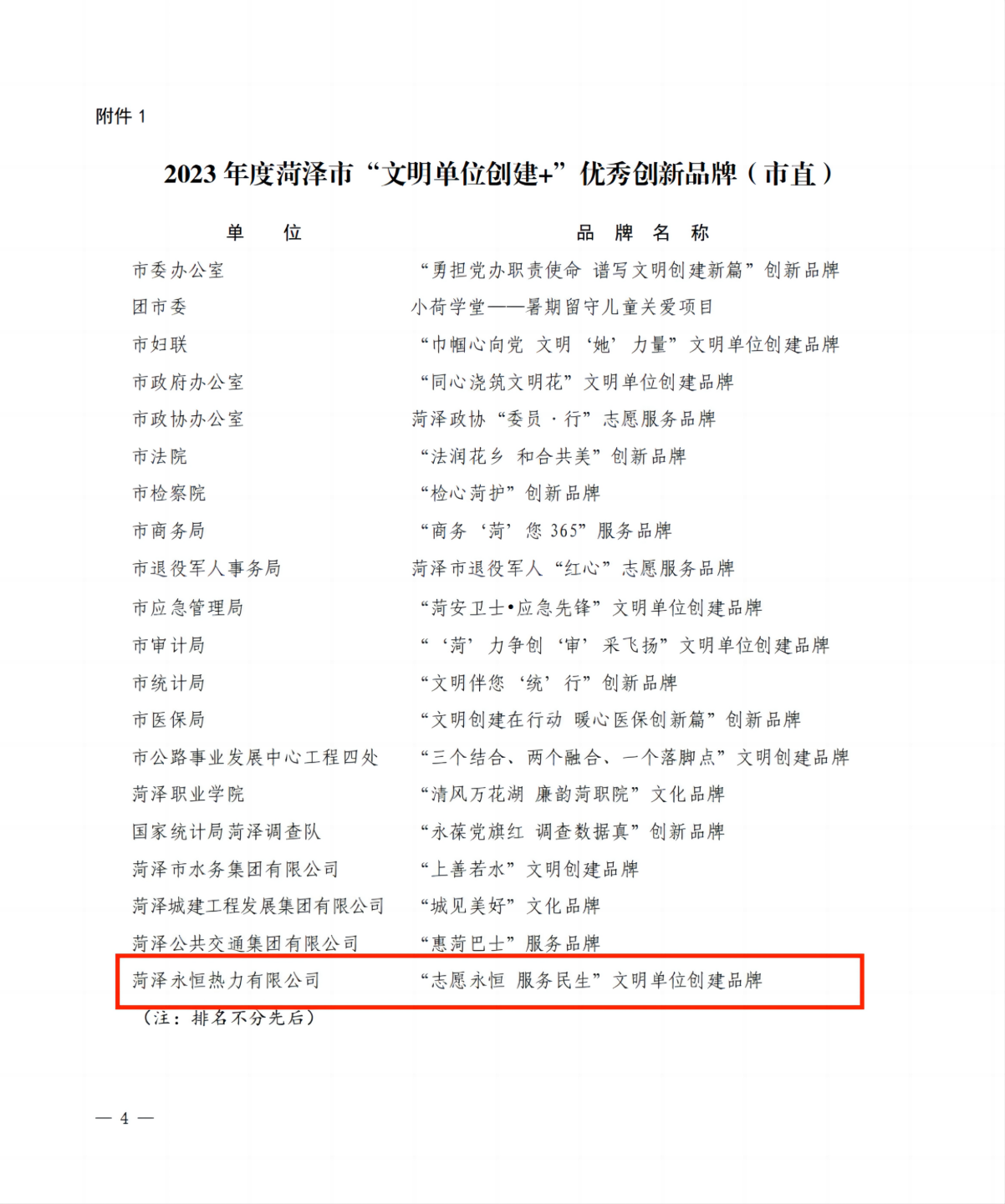 8月31日,菏澤市文明辦下發(fā)《關于公布2023年度菏澤市“文明單位創(chuàng)建+”優(yōu)秀創(chuàng)新品牌的通知 》,菏澤永恒熱力有限公司“志愿永恒 服務民生”文明創(chuàng)建品牌榮獲2023年度菏澤市“文明單位創(chuàng)建+”優(yōu)秀創(chuàng)新品牌。
